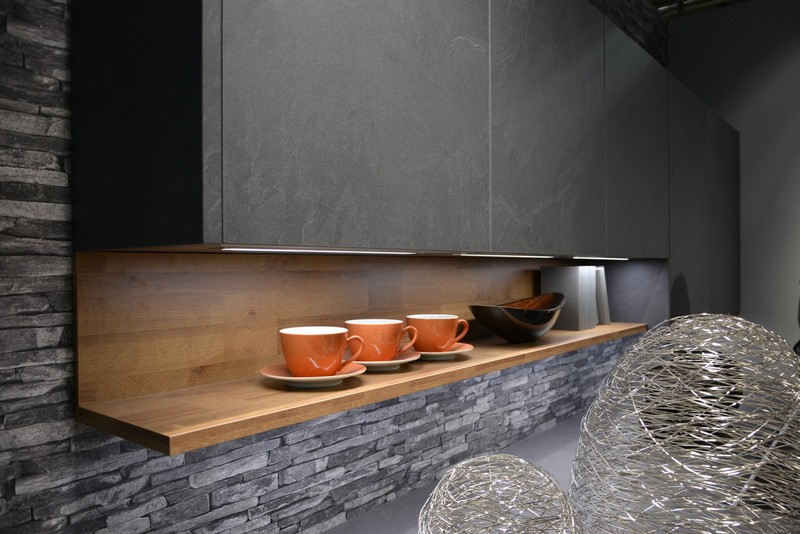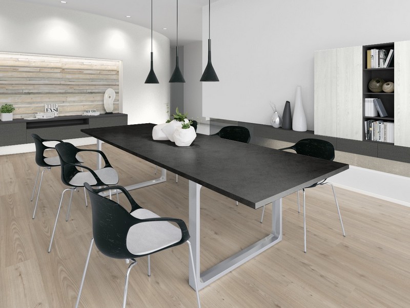 Матовая поверхность с хаотично расположенными рельефными вкраплениями гармонично дополняет поверхности с древесными репродукциями.
