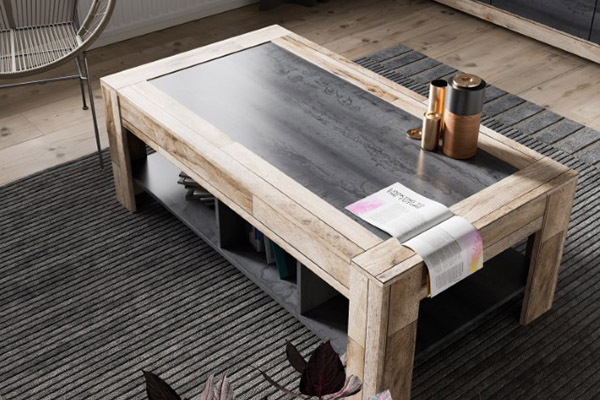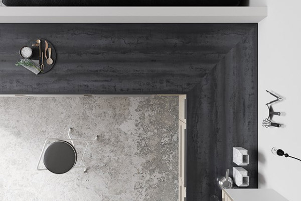 Матовая поверхность с хаотично расположенными рельефными вкраплениями гармонично дополняет поверхности с древесными репродукциями.